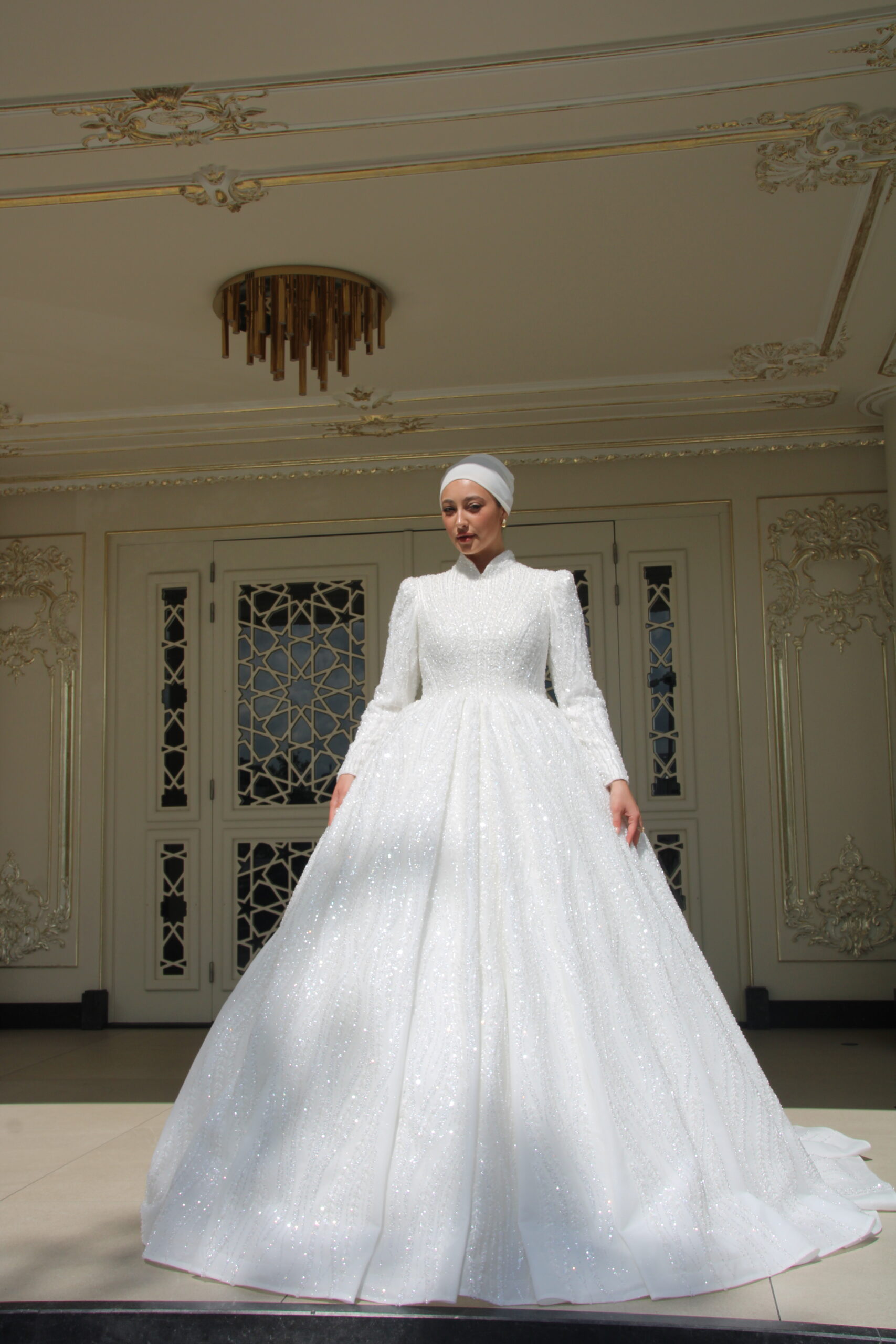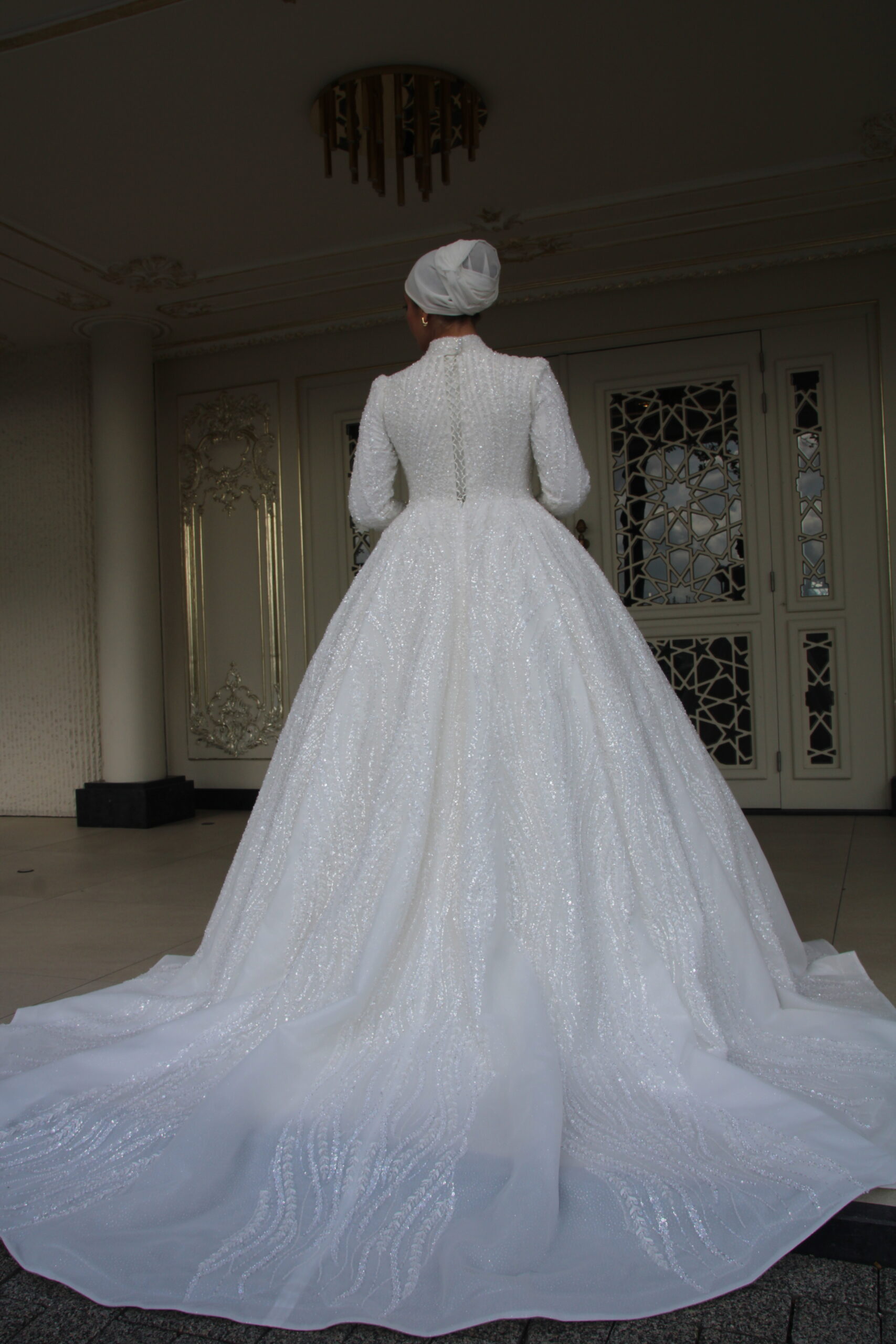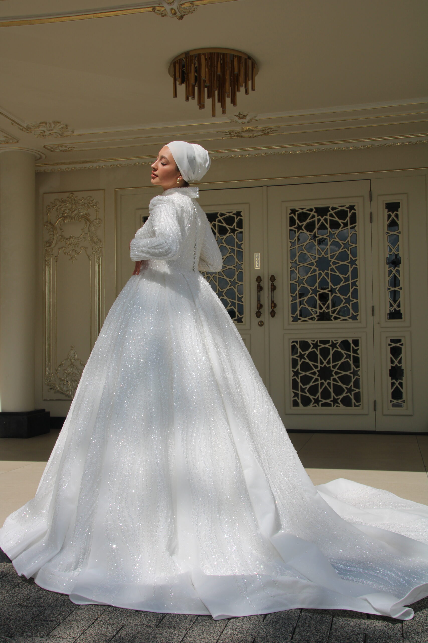 Deze elegante prinsessen trouwjurk is de perfecte keuze voor de bruid die haar grote dag wil vieren in tijdloze stijl en verfijnde romantiek. De jurk is vervaardigd uit luxueus glanzend satijn en prachtig versierd met fijne pailletten die een subtiele schittering geven bij elke beweging. De hooggesloten halslijn en lange mouwen zorgen voor een klassieke en gracieuze uitstraling, terwijl de vetersluiting aan de rug een vleugje romantiek toevoegt. De royale prinsessenrok vloeit prachtig naar de vloer en maakt het geheel compleet.