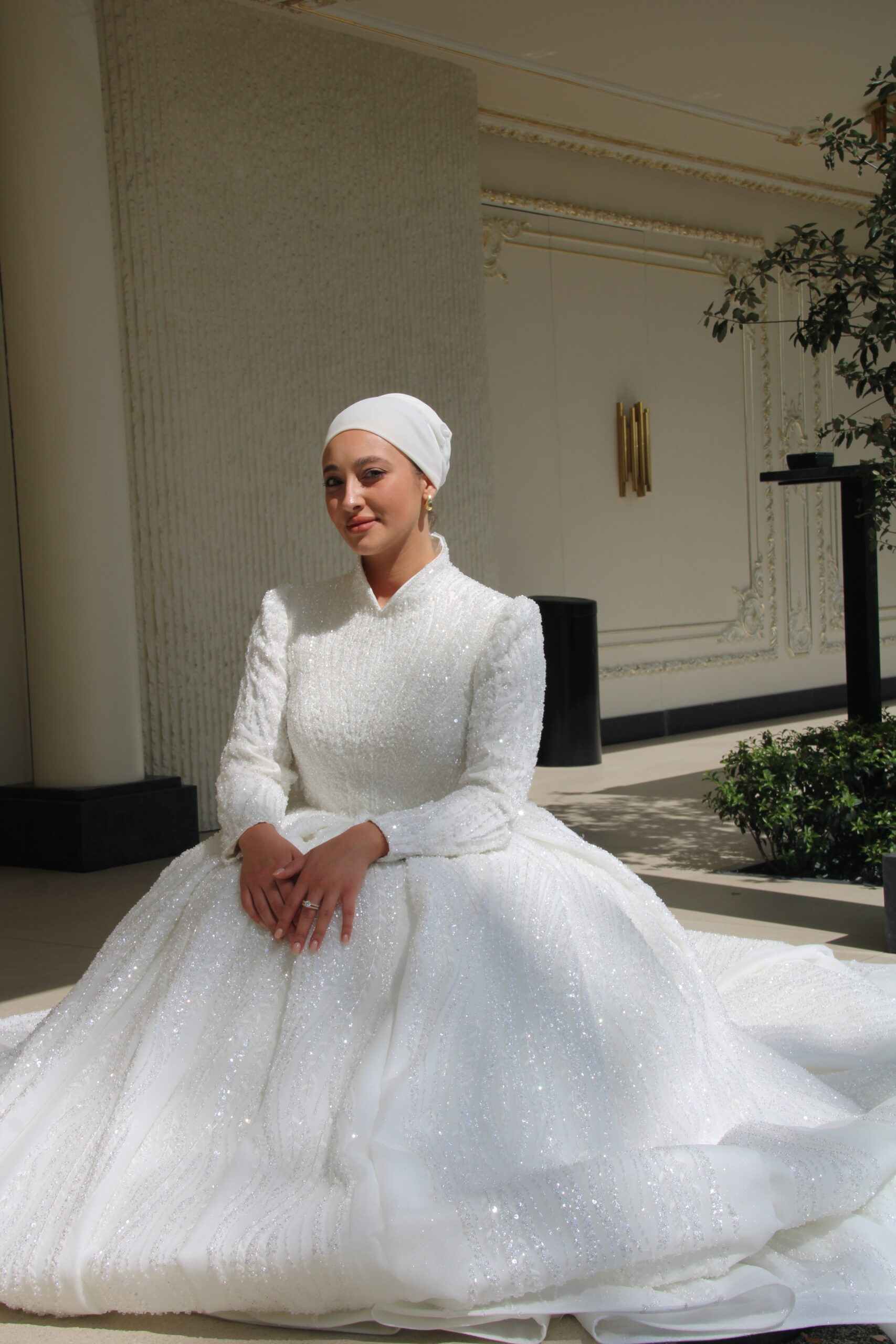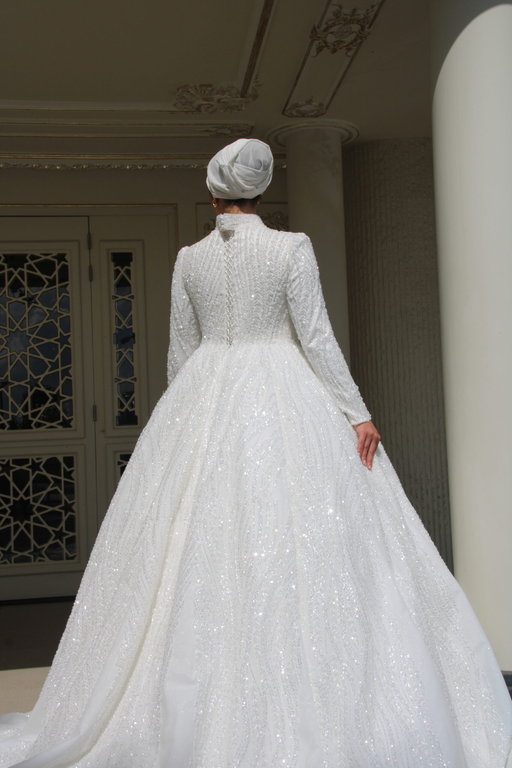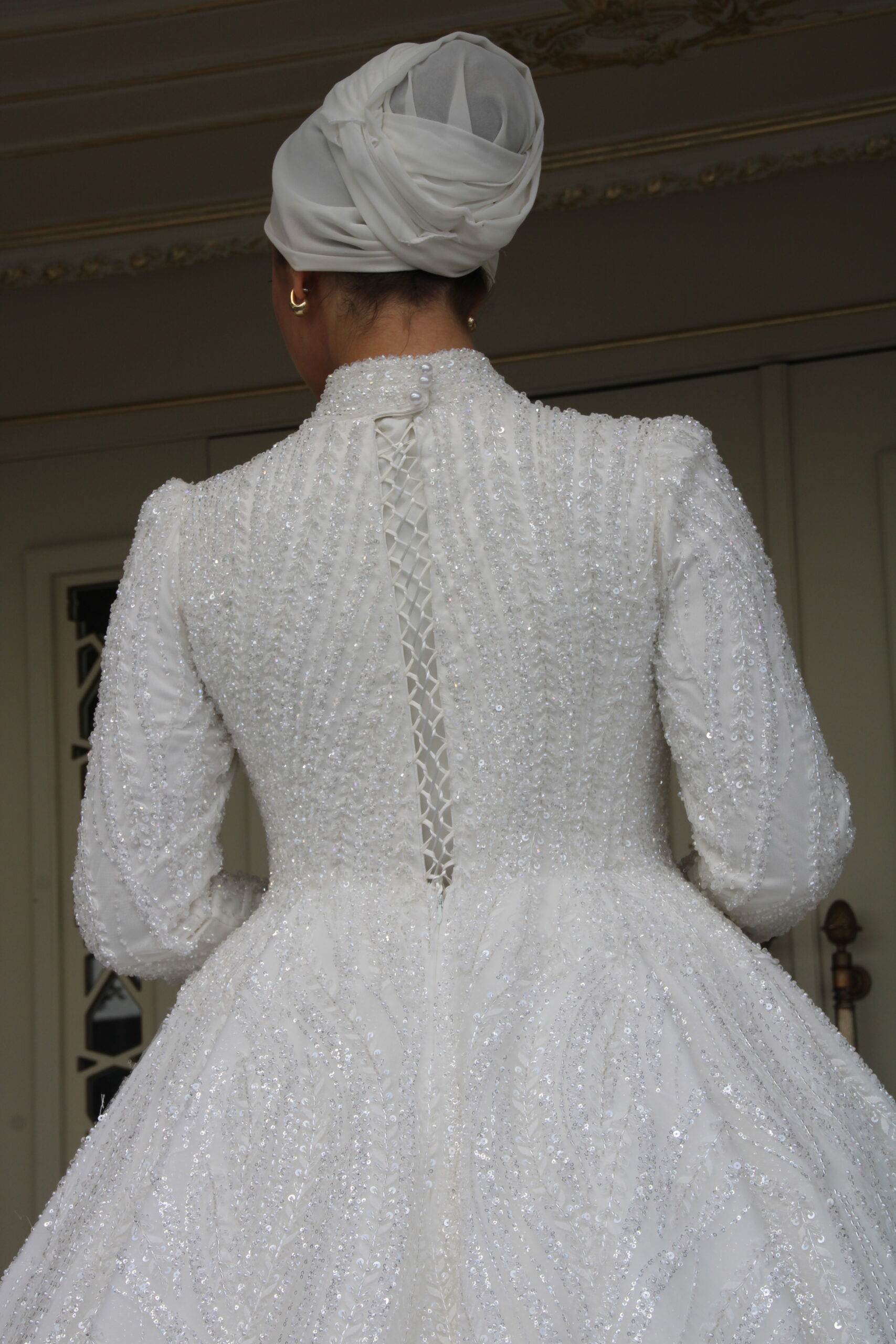 Deze elegante prinsessen trouwjurk is de perfecte keuze voor de bruid die haar grote dag wil vieren in tijdloze stijl en verfijnde romantiek. De jurk is vervaardigd uit luxueus glanzend satijn en prachtig versierd met fijne pailletten die een subtiele schittering geven bij elke beweging. De hooggesloten halslijn en lange mouwen zorgen voor een klassieke en gracieuze uitstraling, terwijl de vetersluiting aan de rug een vleugje romantiek toevoegt. De royale prinsessenrok vloeit prachtig naar de vloer en maakt het geheel compleet.