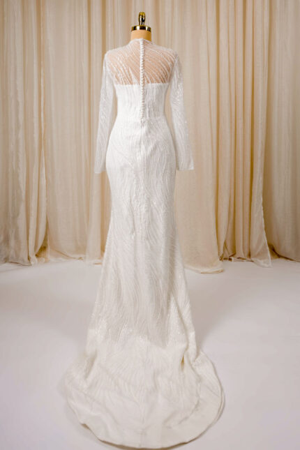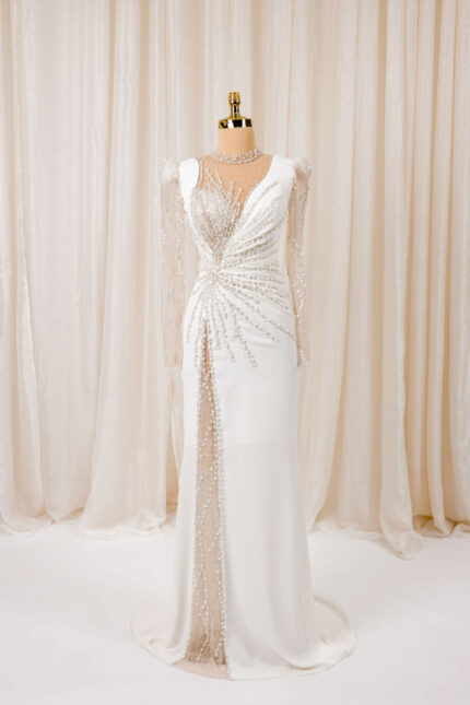 Zeemeermin trouwjurk met ronde hals, lange mouwen en pareldetails