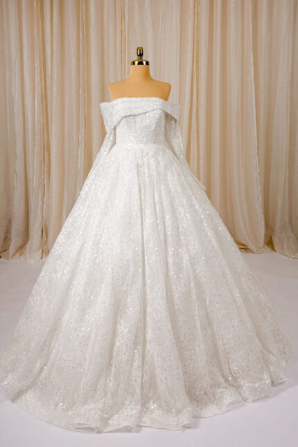 A-lijn trouwjurk met hoge halslijn, lange mouwen en pailletten – Viento Bridal
